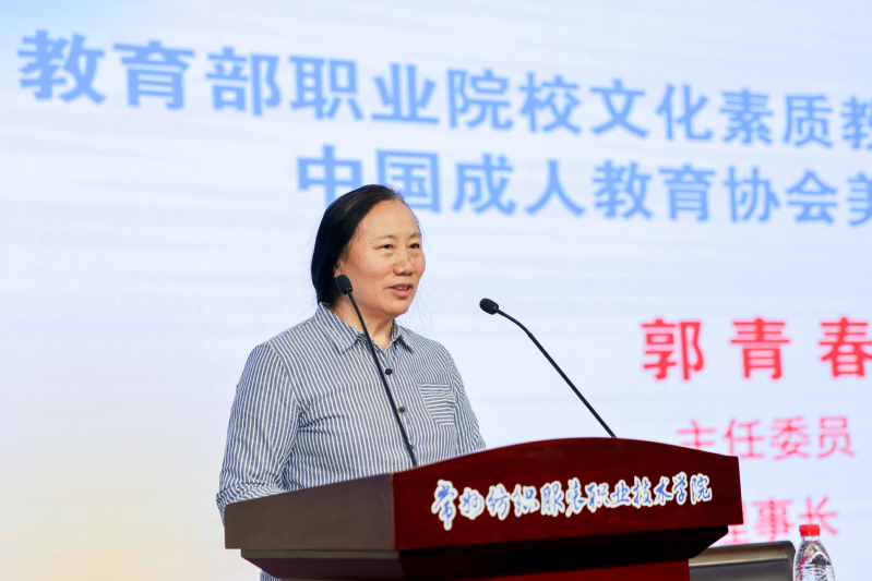 郭青春主任委员围绕本次集体备课会的核心意义展开阐述。她表示,美育专委会举办系列美育集体备课会,旨在凝聚行业共识、提升教师美育教学能力。本次备课会已是第七次举办,为全国职业院校美育工作者搭建了高效的交流学习平台。她详细介绍了美育专委会指导、咨询、服务的核心职能,并就地域美育教材编写、美育专题研讨、优秀美育案例征集等重点工作进行说明,最后预祝本次集体备课会取得圆满成功。